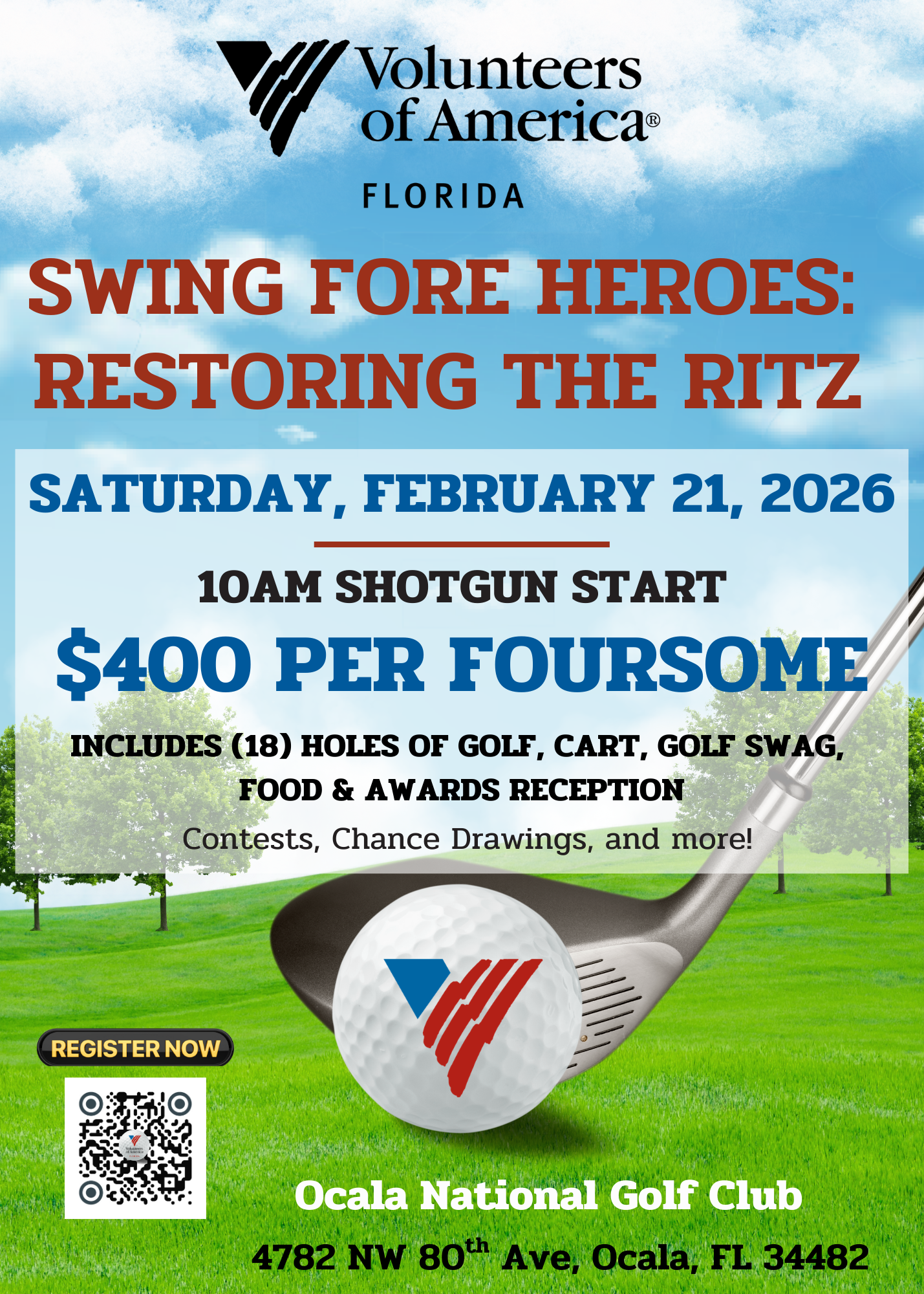 Read More: Swing Fore Heroes Press ReleaseSwing Fore Heroes: Restoring the Ritz Golf Tournament Supports Homeless Veterans in OcalaSwing Fore Heroes Press Release -
