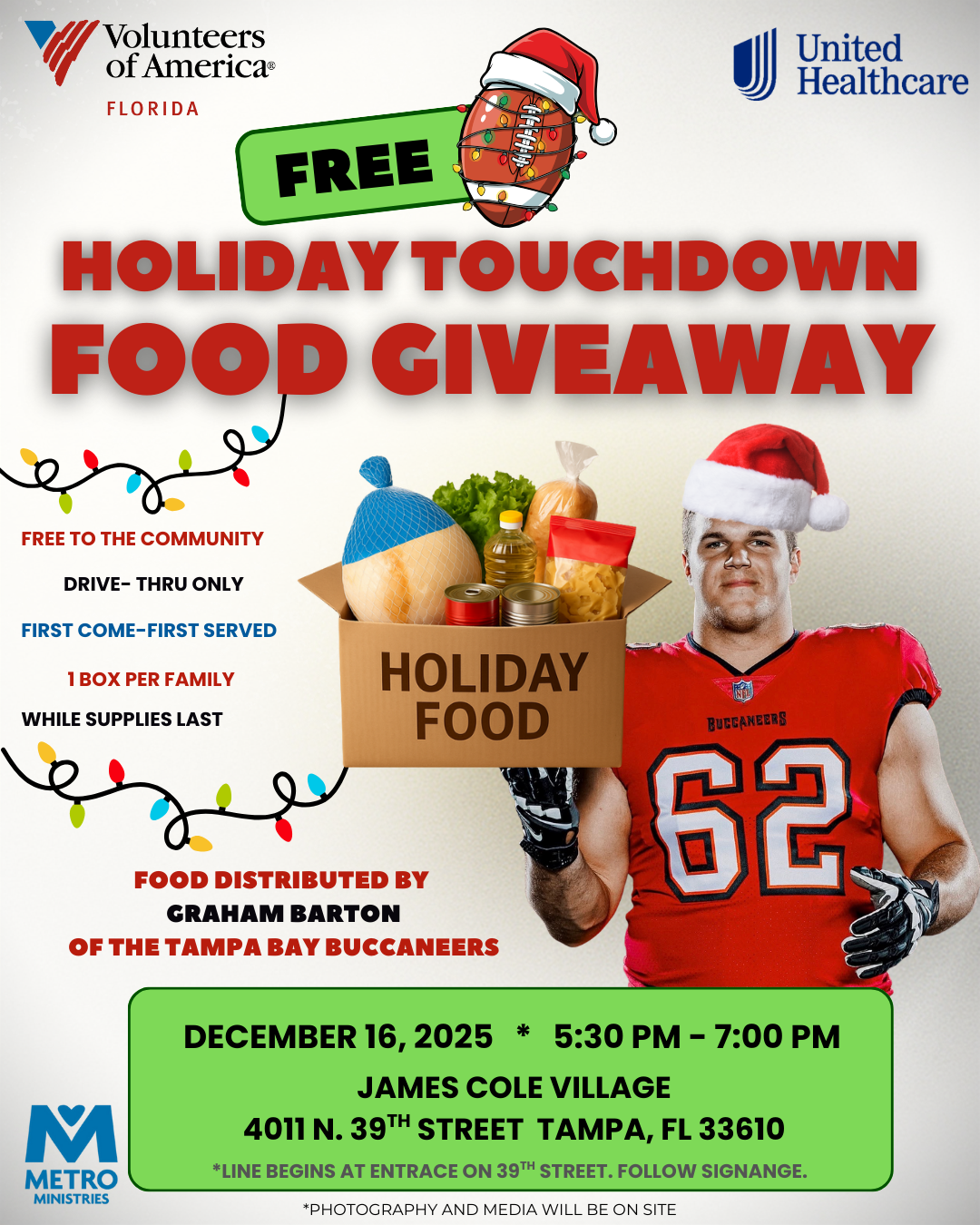 James Cole Villiage 4011 N 39th St, Tampa, FL, United StatesJoin us for a FREE drive-thru holiday food distribution to support families in the Tampa community this season. Each vehicle will receive one holiday food box filled with a turkey, fresh produce, pantry staples, and festive meal items while supplies last.