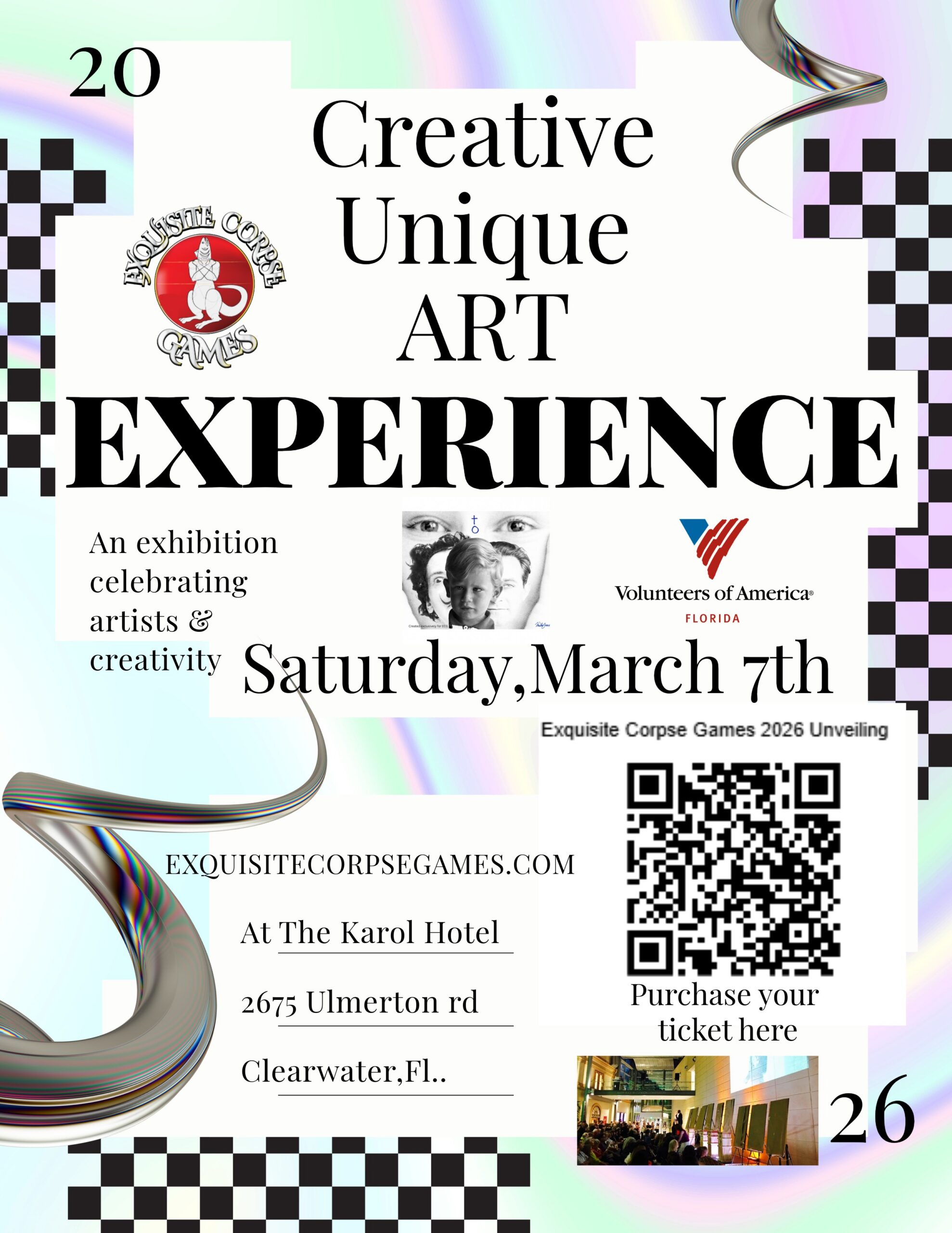The Exquisite Corpse Games invite artists and supporters to be part of a one-of-a-kind creative experience where collaboration, surprise, and imagination collide. Rooted in a 100-year-old surrealist tradition and reimagined in St. Petersburg, FL, this modern art game brings together painters, sculptors, photographers, poets, musicians, and filmmakers to create a single, thought-provoking work of art without knowing their collaborators until the final reveal. The journey culminates at the VIP Artists Game Unveiling on Saturday, March 7, 2026, at 6:00 p.m. at The Karol Hotel. This exclusive gathering gives participating artists the first opportunity to meet, connect, and experience the completed...